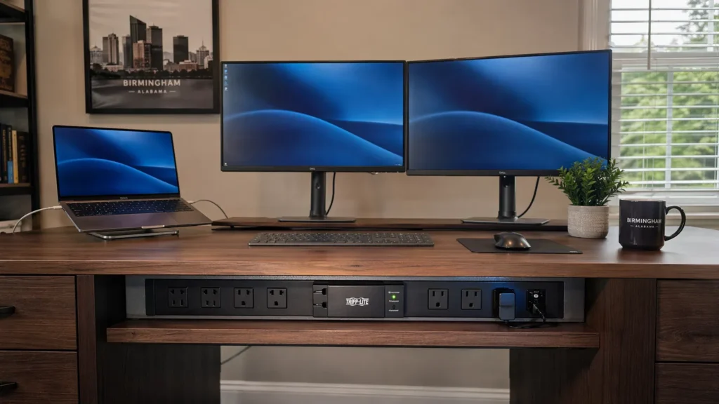 We all know the “Magic City” weather. Lightning strikes in Jefferson County are common, and the resulting power surges can fry your motherboard in a heartbeat. A standard power strip from a big-box store isn’t enough. We install whole-home and point-of-use surge protection specifically designed for high-value home offices.